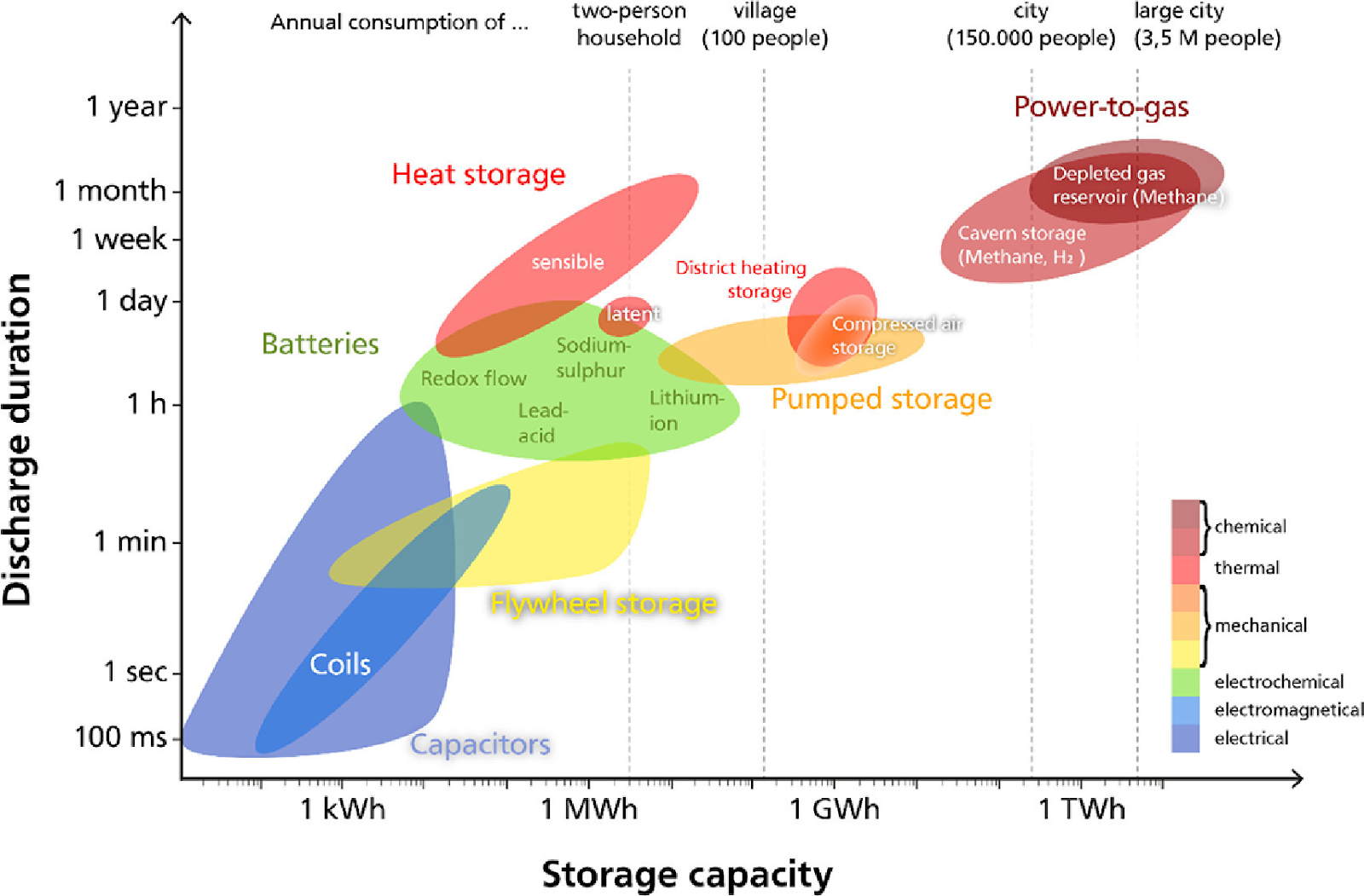 Within the low heat bracket is a category for district heating and cooling, large-scale residential and commercial deployments typically in dense urban environments that help shift season heat loads for comfort in living spaces. These large-scale systems include aquifer thermal storage (ATES), borehole fields (BTES), and pit thermal storage (PTES). The size of these systems is typically immense, allowing the banking of thermal energy over months rather than hours or days, often balancing summer and winter loads in district heating and cooling networks.